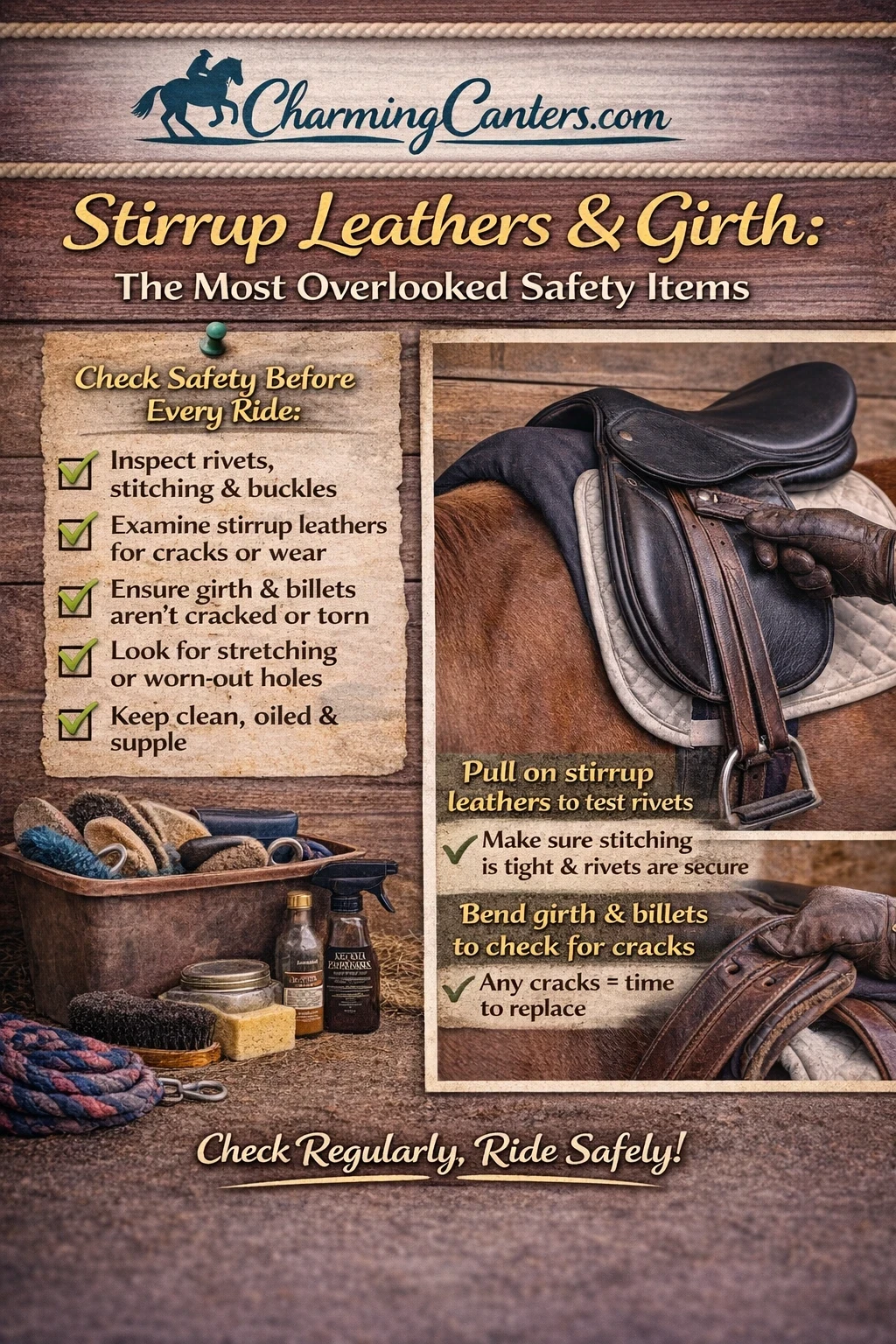 - Check girth and stirrup leather stitching weekly