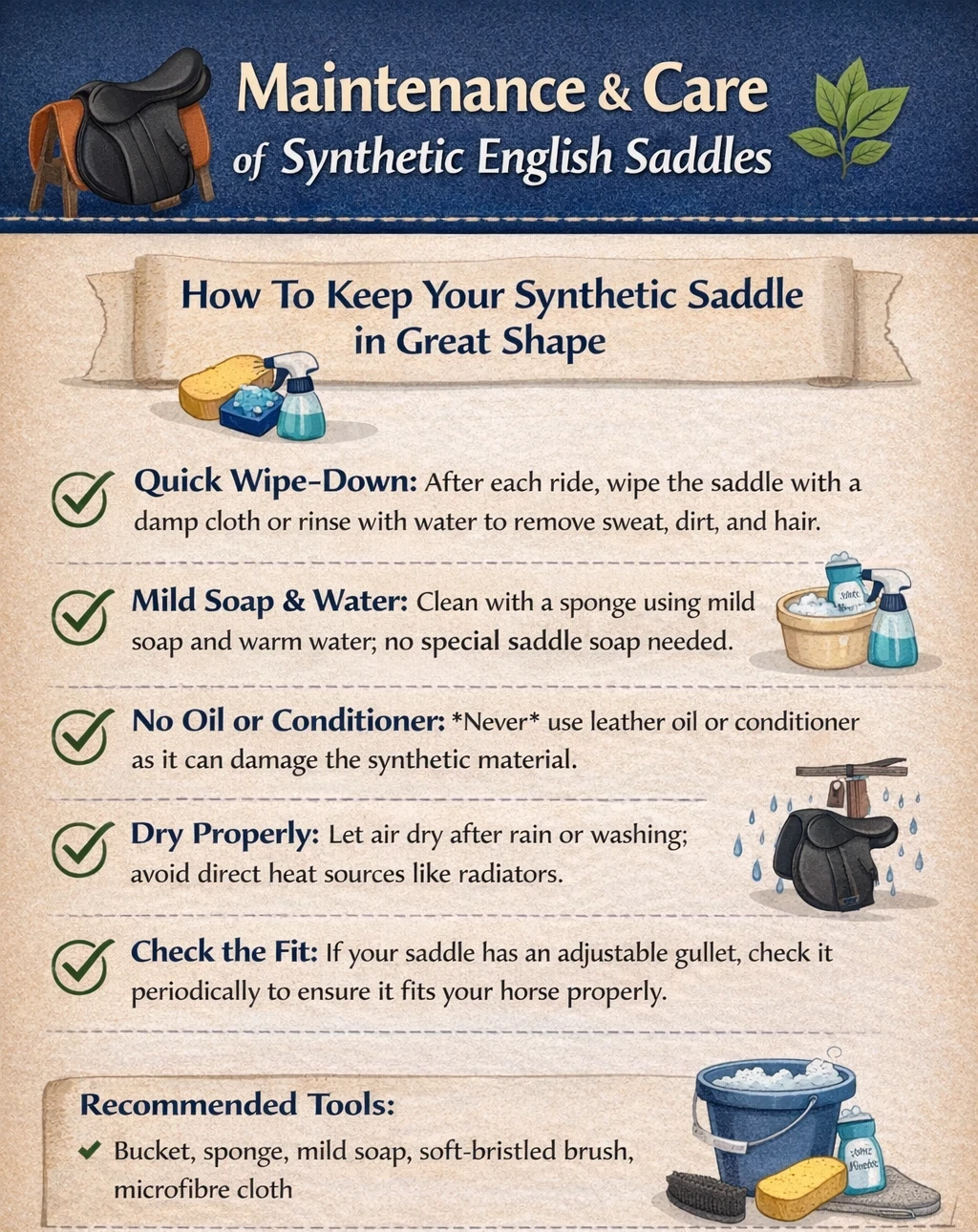 - Cleaning: Use a damp cloth and mild soap if needed. Dirt, sweat, and dust come away much more easily than from most leather saddles.